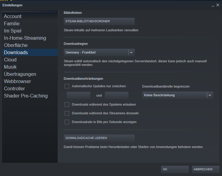 Stellen Sie sicher dass Ihre Internetverbindung fehlerfrei funktioniert denn das Steam-Update wird aus dem Internet heruntergeladen. Um in die Download-Einstellungen von Steam zu gelangen führen Sie folgende Schritte durch. Der Download von Spielen auf Steam geht nur sehr langsam voran.
